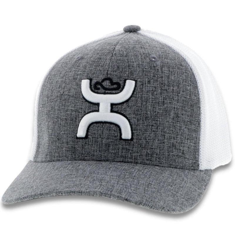 Hooey YOUTH cap offered with a solid heather grey front and white mesh back for ventilation. This mid profile 6-panel cap comes with a curved bill. Made with an internal FlexFit band that snugs the head for the perfect fit. Hooey tag on back seam. White puffed embroidery Hooey Up on Grey front. This is a great looking cap!